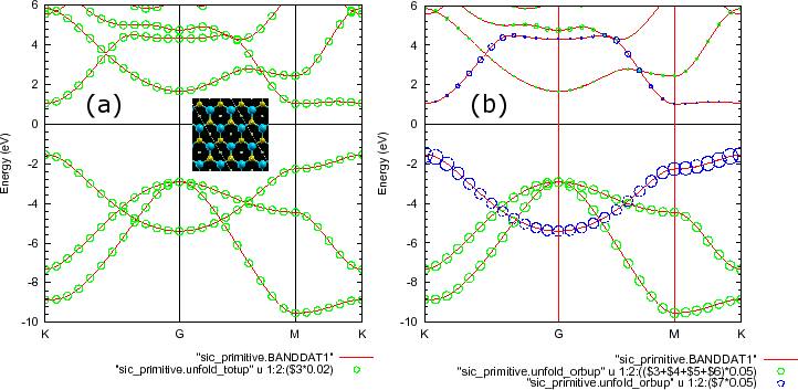 gnuplot> p "sic_primitive.BANDDAT1","sic_primitive.unfold_orbup" u 1:2:(($3+$4+$5+$6)*0.05) w circle, "sic_primitive.unfold_orbup" u 1:2:($7*0.05) w circleこのコマンドにより、図 50 (b)を得ることができます。 この例では、