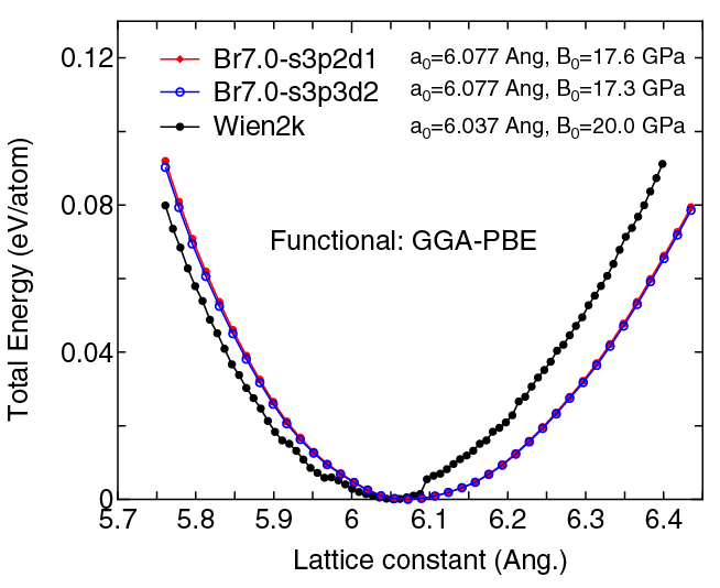the Murnaghan equation of state. The difference between Br7.0-s3p2d1 and Br7.0-s3p3d2